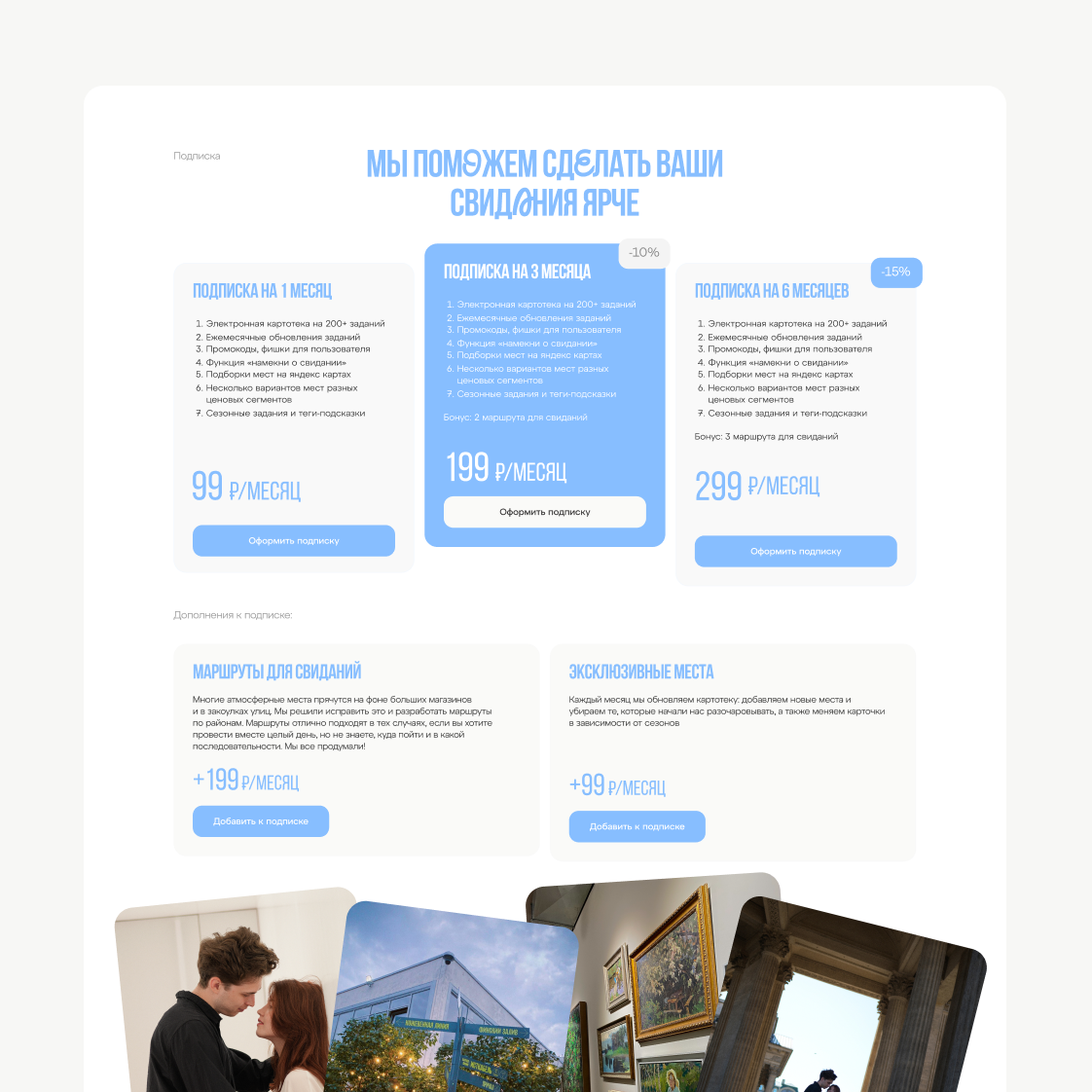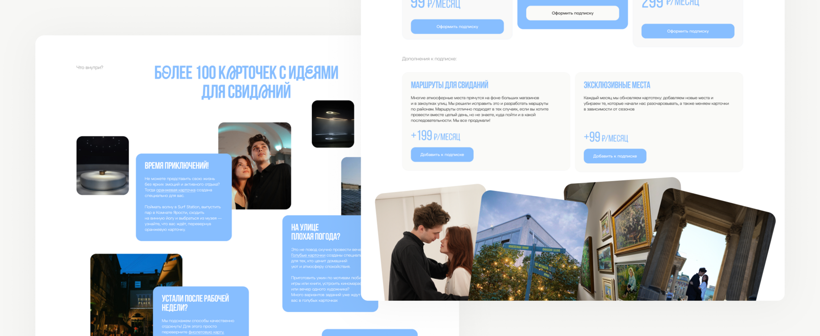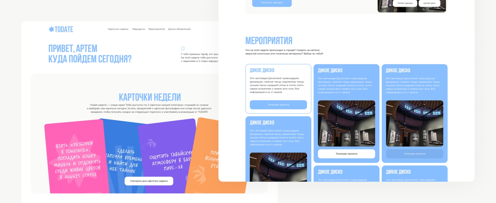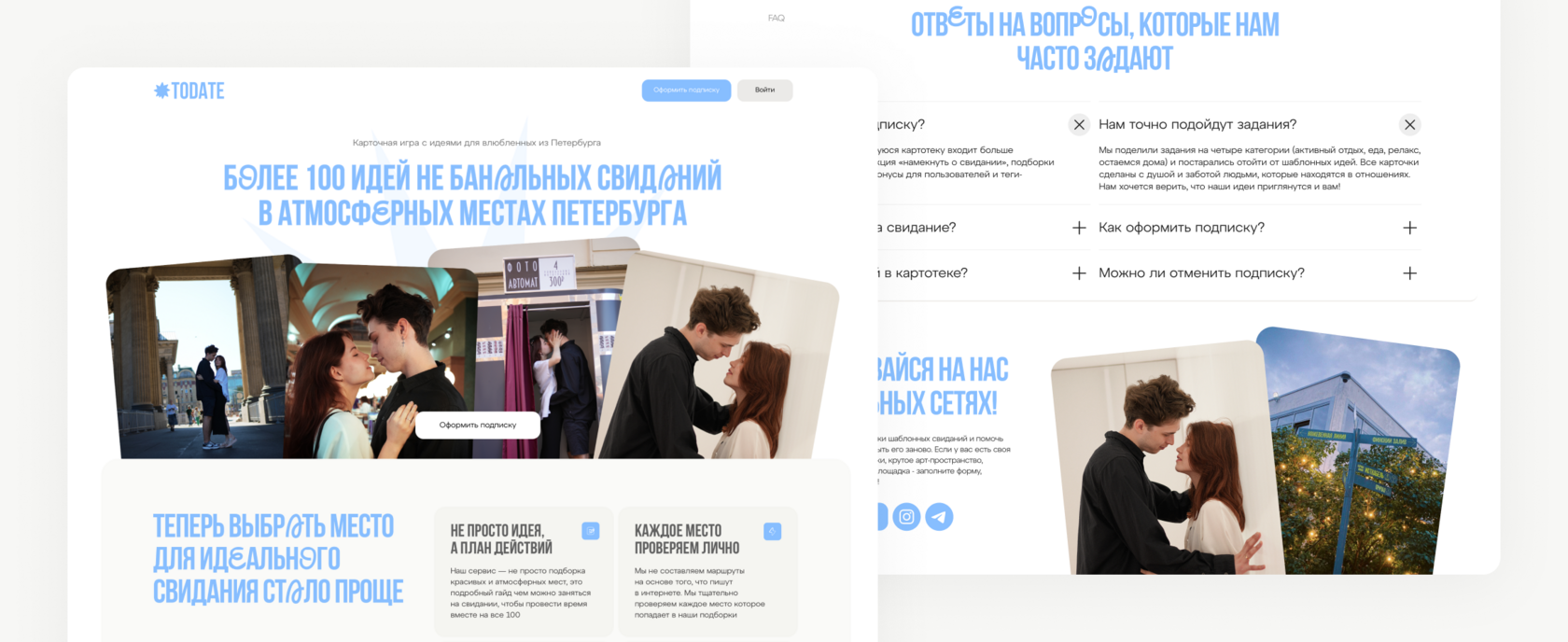 Разработан яркий, легкий и интуитивно понятный сайт с карточками идей, тематическими подборками и возможностью подписки. Каждое место проверяется вручную, а сервис регулярно обновляется, предлагая новые маршруты и эксклюзивные локации. «ToDate» превращает поиск идеального свидания в увлекательную игру, делая романтические вечера особенными.